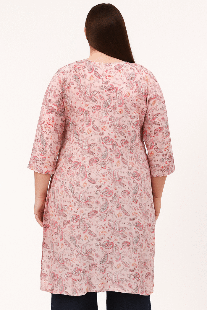 Make a graceful style statement with this charming rayon flex kurti, designed in a soothing pink base with all-over paisley prints. The soft, breathable fabric drapes beautifully and offers a smooth feel, perfect for all-day wear.