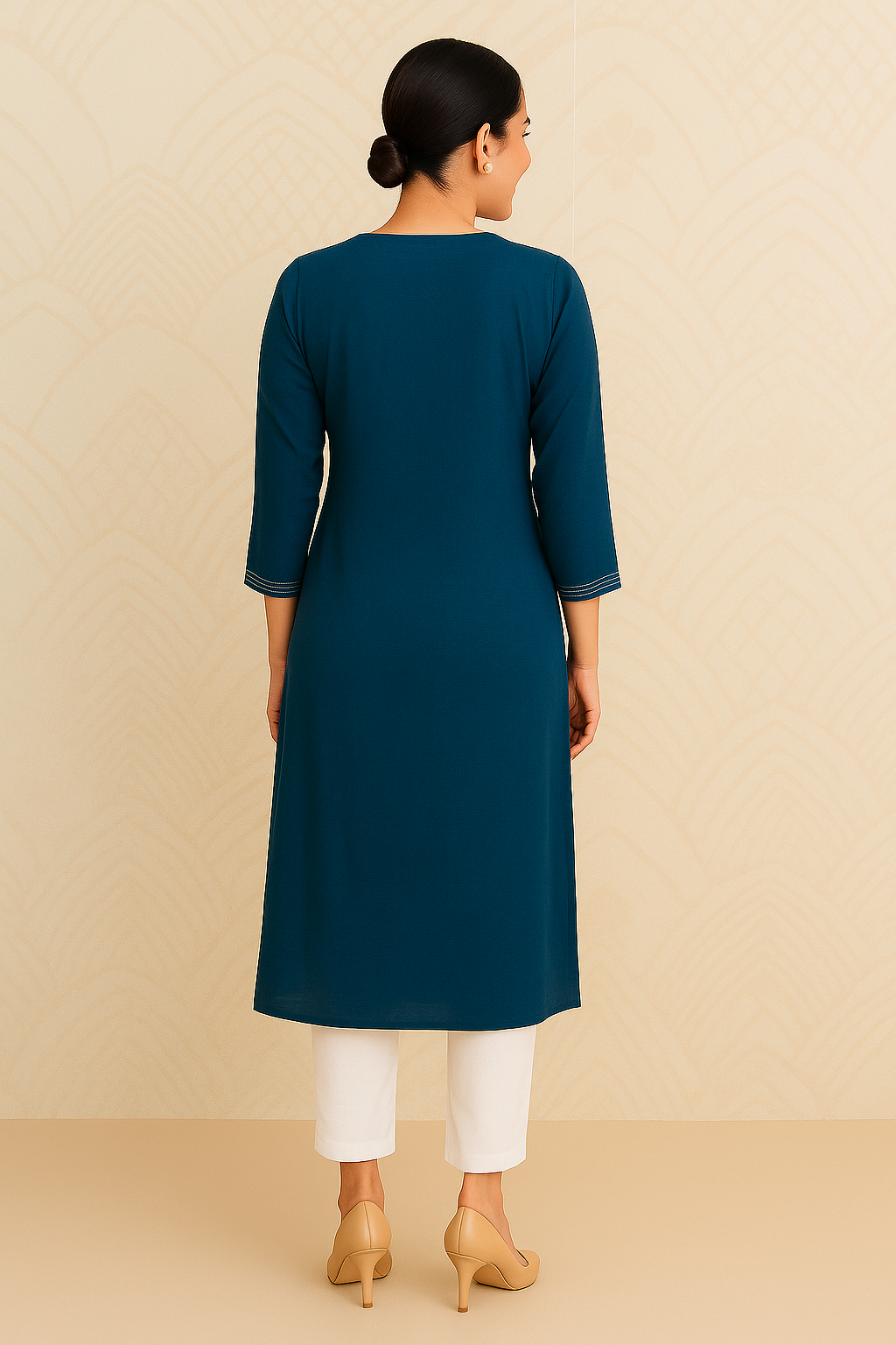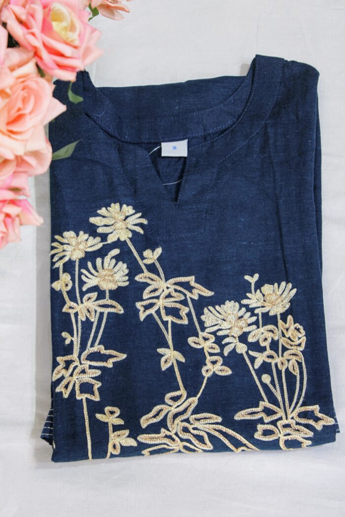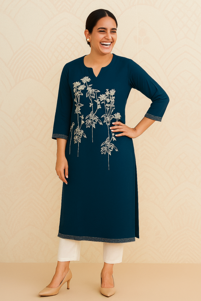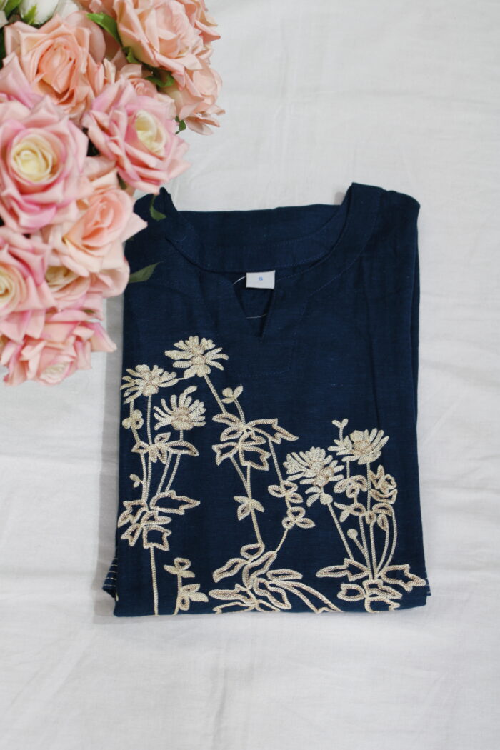 Step into effortless elegance with our Blue Blossom Kurti, crafted in breathable dobby cotton fabric. This below-knee length kurti features intricate floral thread work that adds a touch of artisanal charm. The soft texture of the fabric ensures all-day comfort, making it perfect for everyday wear or casual outings. Pair it with white pants or denim for a chic, graceful look.