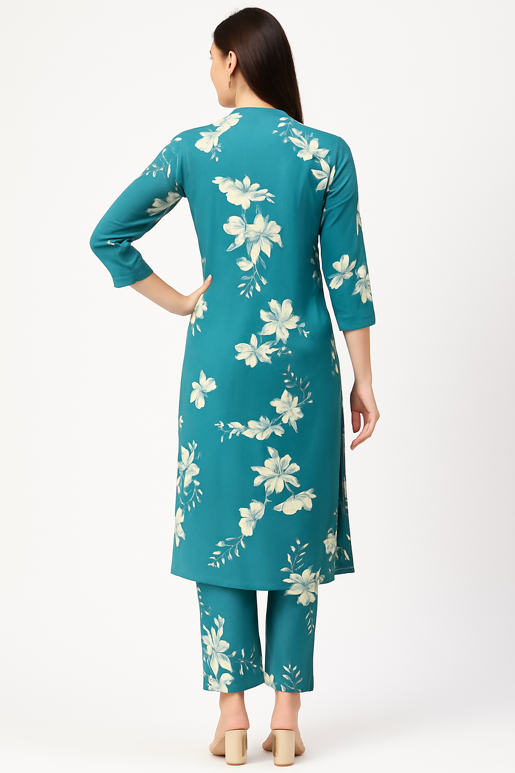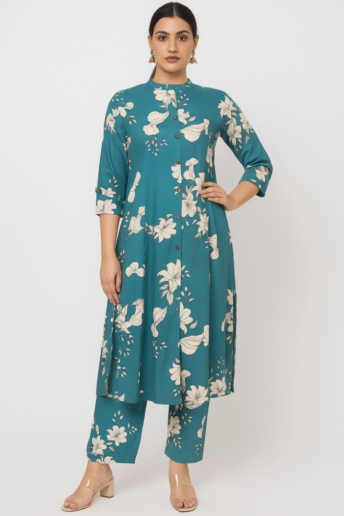 Elevate your everyday style with this elegant light blue floral print co-ord set, made from 100% pure cotton for all-day breathability and comfort. Featuring a stylish mandarin collar, 3/4th sleeves, and wooden button detailing in front, the kurta is tailored in a flattering A-line fit. Paired with matching loose-fit cotton pants, this set blends tradition with a contemporary touch—perfect for casual outings, workwear, or festive occasions.