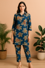 Be the first to review “Blue muslin co-ord set featuring a vibrant floral print”