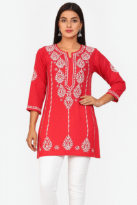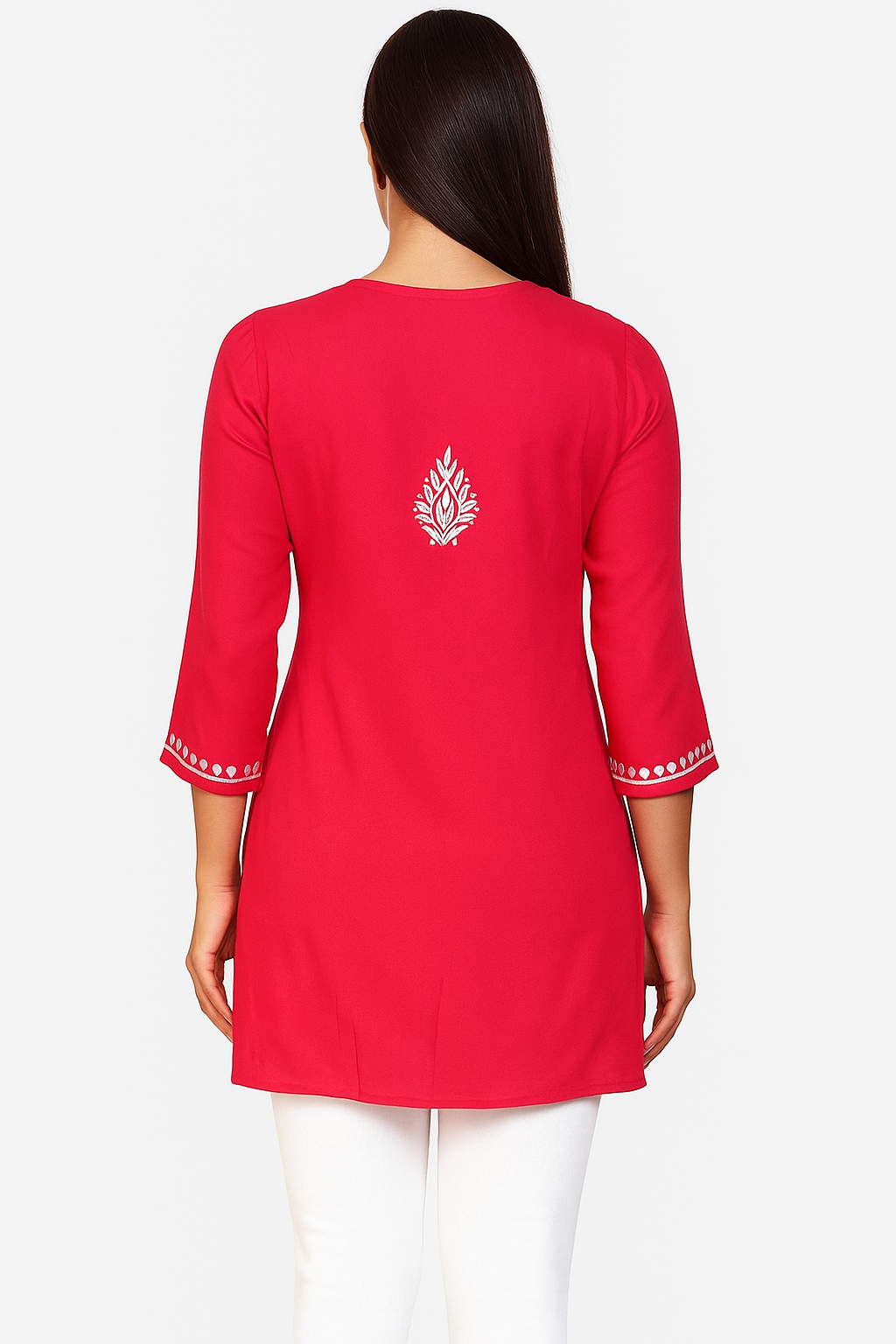 Elevate your ethnic wardrobe with this beautifully handcrafted red tunic featuring exquisite Chikankari hand embroidery. Designed in a rich viscose fabric, this kurti offers a soft, breathable feel with a graceful fall. The intricate white thread work on the front, back, and sleeves showcases timeless artistry, while the classic round neckline and three-quarter sleeves add a touch of elegance.