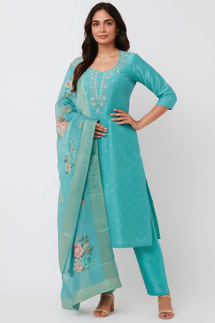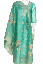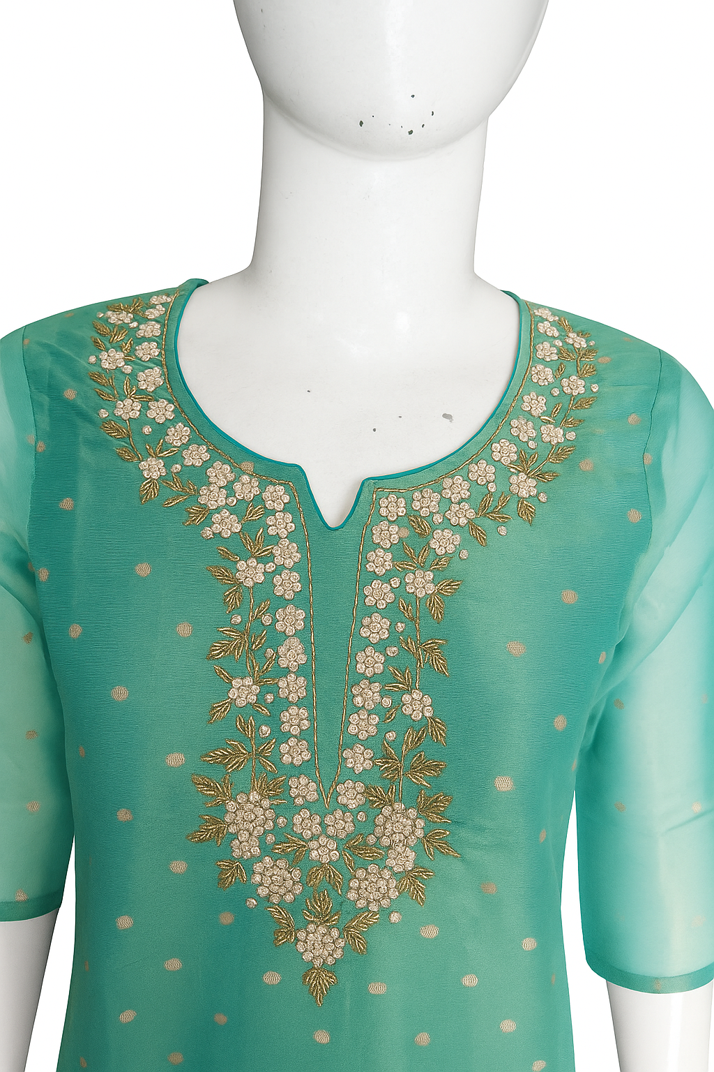 Elevate your ethnic wardrobe with this graceful ensemble, crafted in luxurious tissue fabric and lined with soft cotton for all-day comfort. The outfit features a beautifully detailed notch neckline, hand-embellished with delicate pearl work, exuding timeless elegance. Paired with a lightweight, sheer organza dupatta, this set is perfect for festive occasions, celebrations, or elegant day outings.