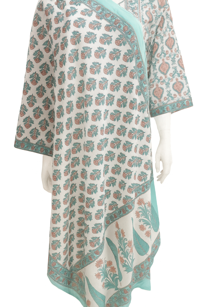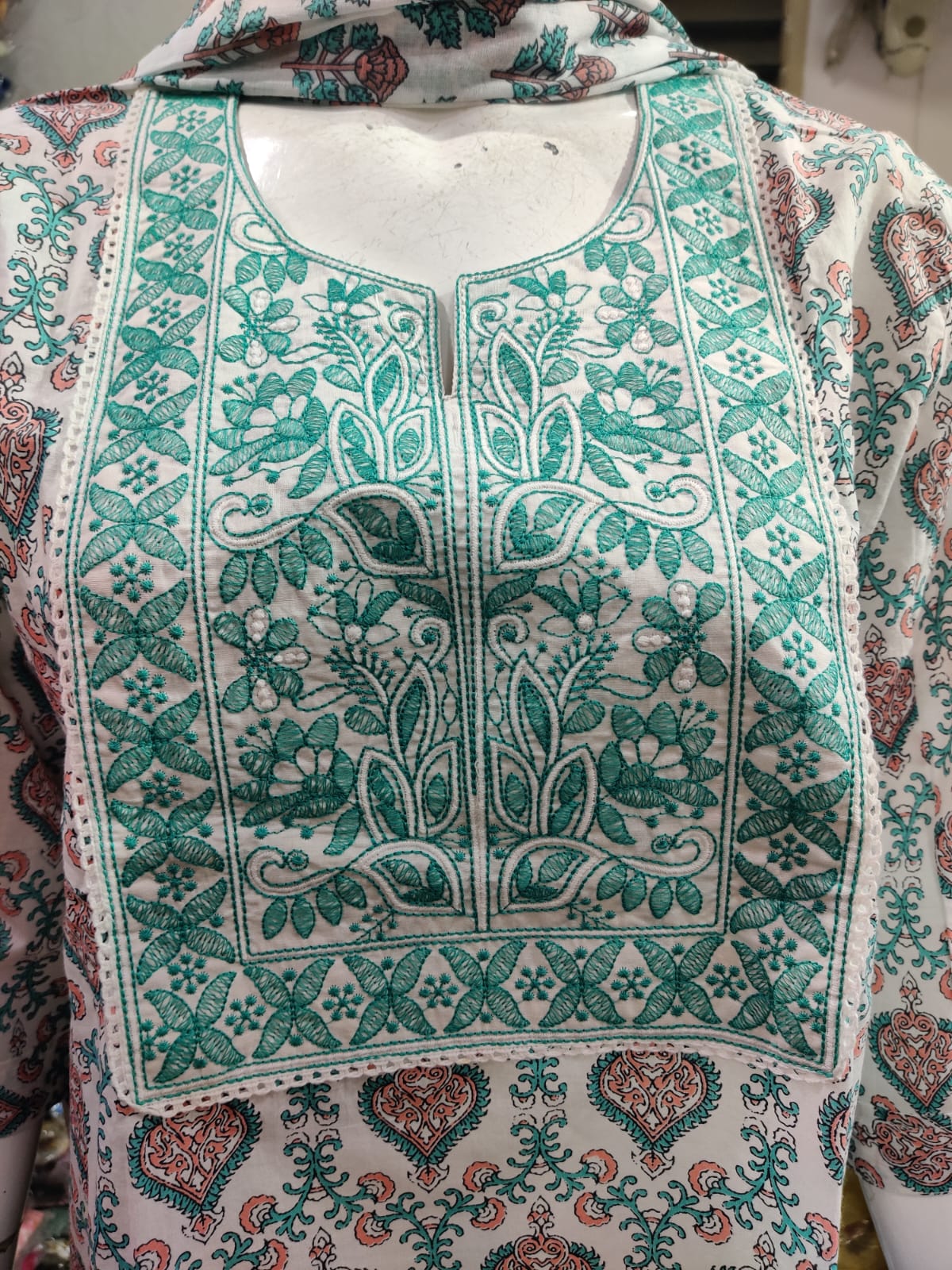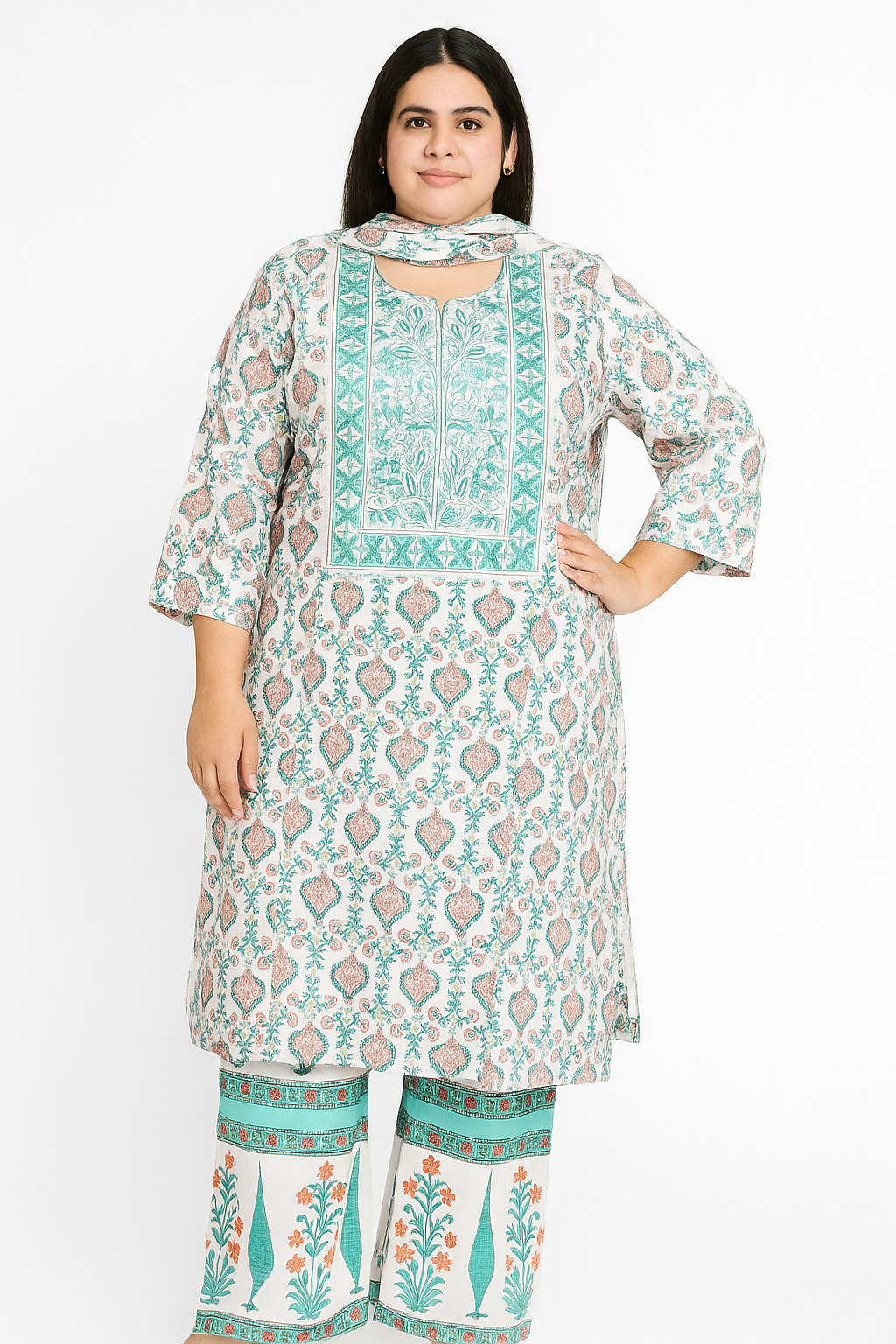 Step into summer freshness with our Gulmohar Cotton kurta set, specially crafted for plus-size comfort and charm. Made from breathable cotton, this ensemble features a vibrant white and turquoise floral print that exudes a cheerful, breezy vibe. The kurta is beautifully enhanced with delicate embroidery work on the neckline , adding a subtle festive touch. Paired with printed palazzo pants and a matching dupatta, this set is perfect for daytime outings, casual gatherings, or festive get-togethers.