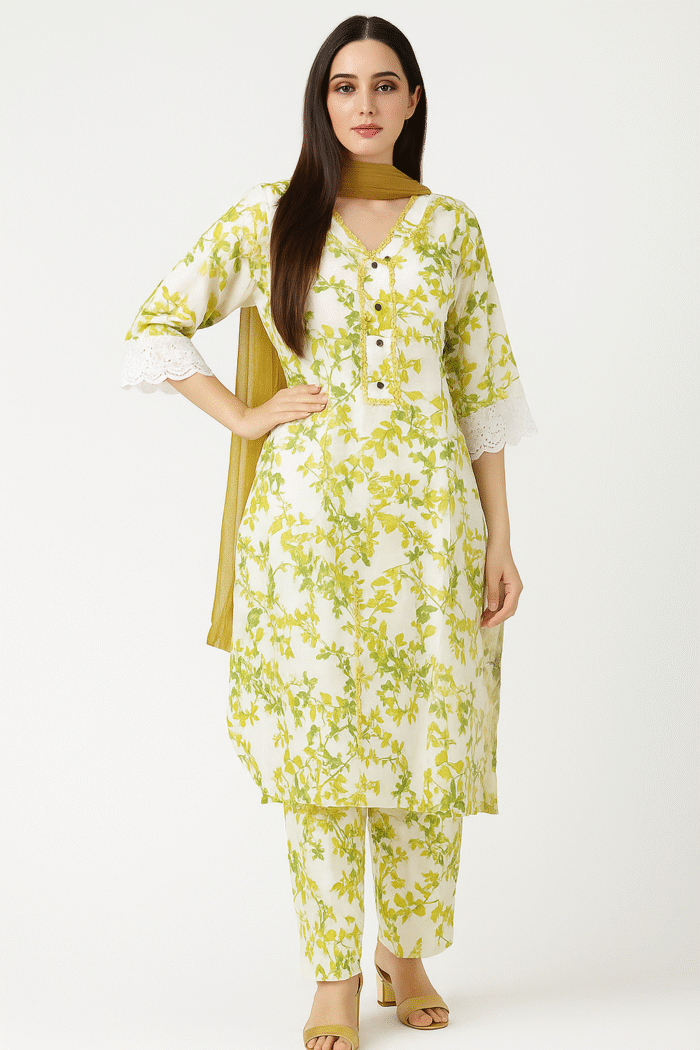 Bring effortless grace to your everyday ethnic style with our Ivory Garden Printed Rayon Suit Set. Made from soft and breathable rayon fabric, this set features a soothing off-white base adorned with delicate green and mustard floral prints. The ensemble is elevated with thoughtful details like a round neckline, lace work, and wooden buttons, giving it a fresh and handcrafted look.
