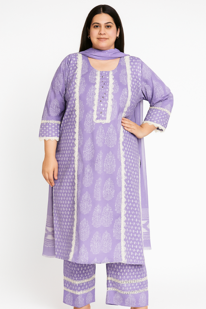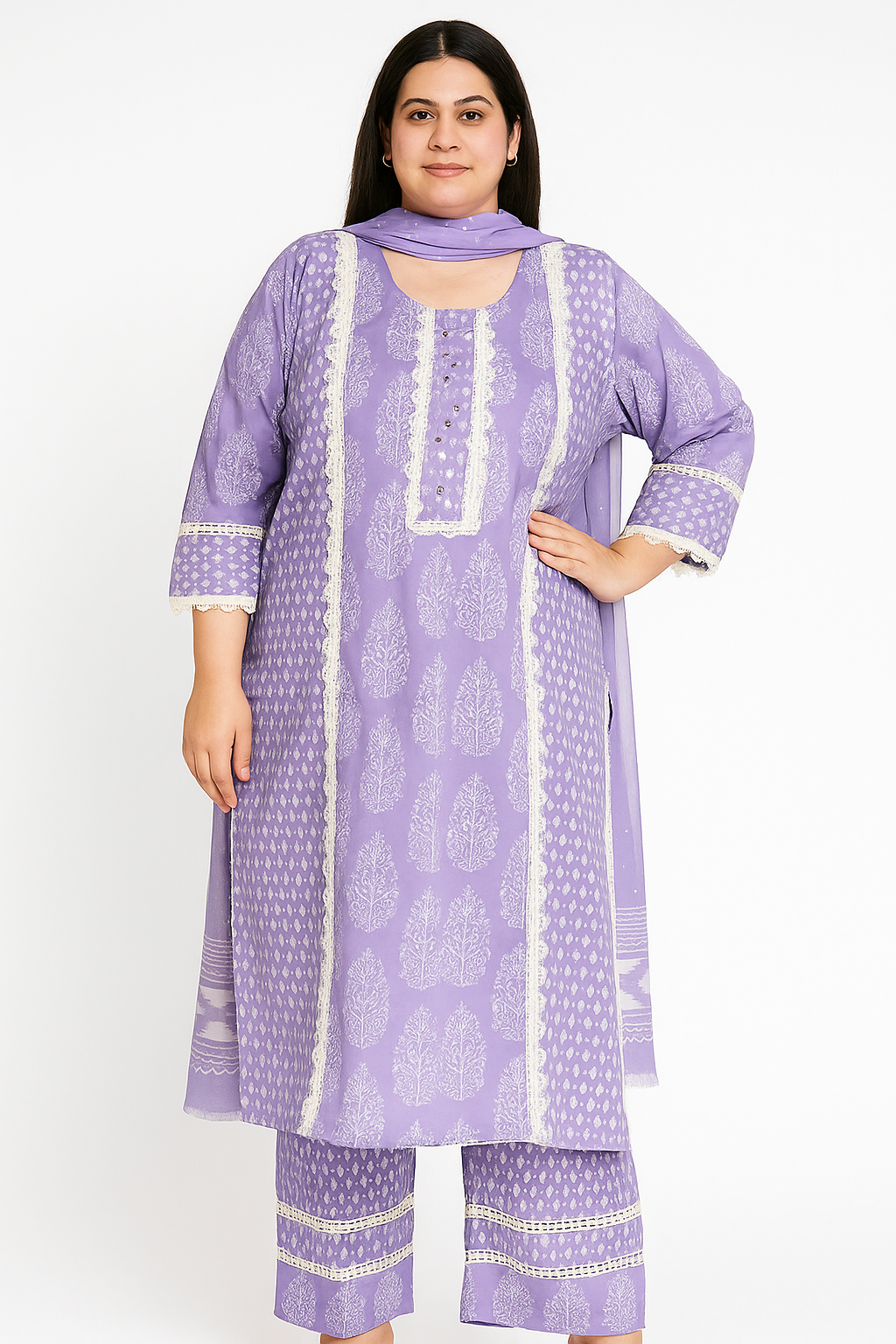 Lavender Grace Plus-Size Cotton Kurta Set with Lace Detailing