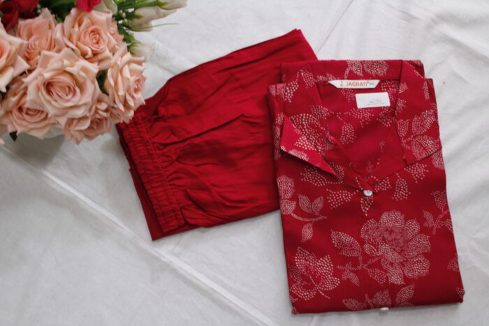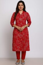 Add a touch of grace and confidence to your everyday look with this elegant magenta kurti with pant co ord set. Designed in a vibrant shade of pink and adorned with subtle bandhani prints, this front-buttoned kurti features a smart collar, 3/4th sleeves, and a flattering straight silhouette. The soft, breathable fabric ensures comfort all day, while the coordinated solid pink palazo complete the effortlessly stylish ensemble. Ideal for daily wear, work, or casual outings.