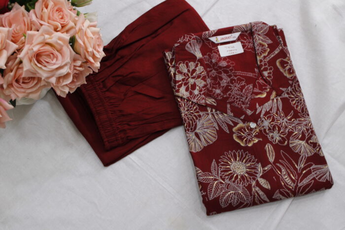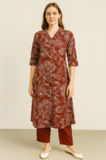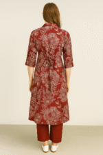 Make a graceful statement with the Saanvi Maroon Bloom Printed Kurti with pant co-ord set , designed for comfort, class, and everyday elegance. This kurti set features a rich maroon base enhanced with delicate beige botanical and floral motifs that add a timeless appeal. The shirt-collar neckline and button-down front give it a structured look, while the 3/4th sleeves and relaxed fit keep it breezy and wearable all day. A tie-back detail at the waist adds shape and definition to the silhouette. The set is completed with solid maroon straight-fit pants, making it effortlessly stylish for both casual and semi-formal occasions.