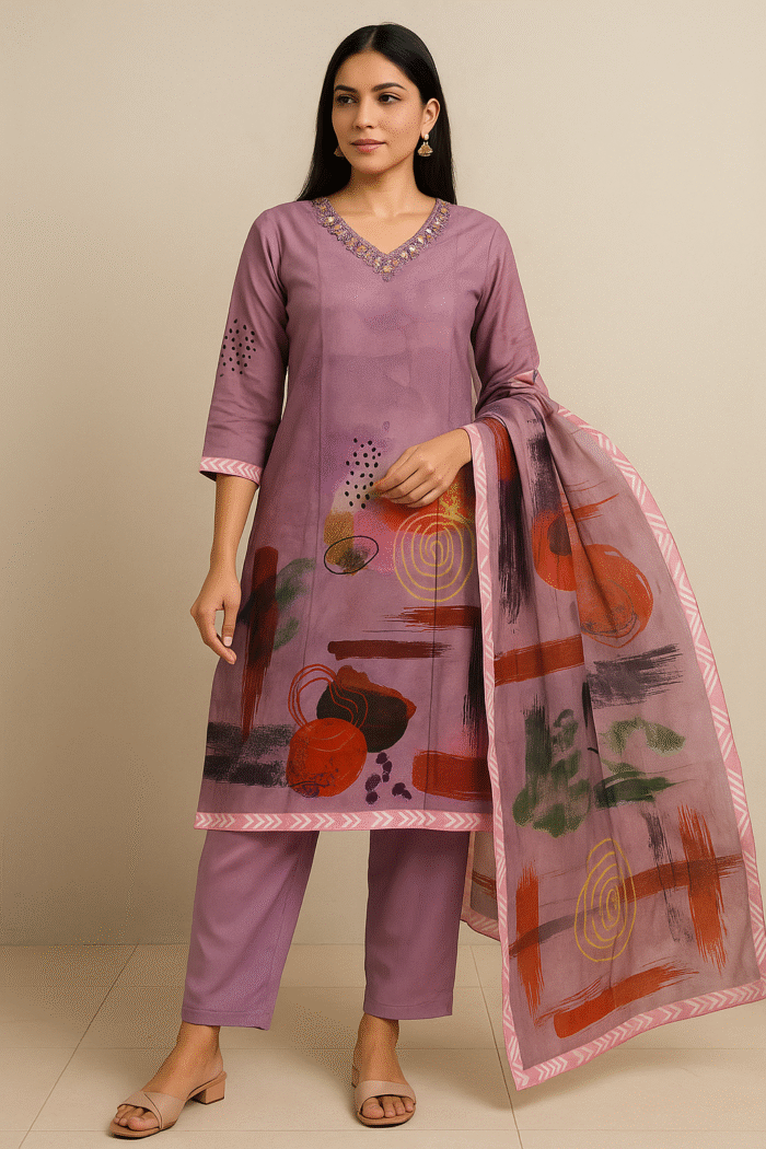 Make a graceful statement with this sophisticated mauve kurta set, thoughtfully designed for the modern woman who cherishes tradition. Crafted from soft, flowy fabric, the kurta features a 4-inch extended length for added elegance and comfort. The eye-catching abstract print in rich hues of red, black, green, and yellow brings an artistic flair, while the delicately hand-embroidered neckline with sequin and threadwork adds a touch of festive sparkle.
