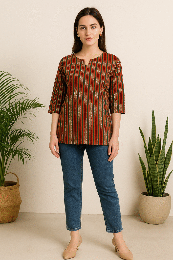 Step into vibrant elegance with this Multicolor Striped Poly Cotton Tunic, designed to add a pop of color and style to your everyday wardrobe. Crafted from breathable cotton fabric, this tunic offers a comfortable fit with its 3/4th sleeves and subtle round notch neckline. The structured silhouette flatters all body types, making it perfect for both work and casual outings. Pair it with jeans, leggings, or cigarette pants for a versatile and chic look.