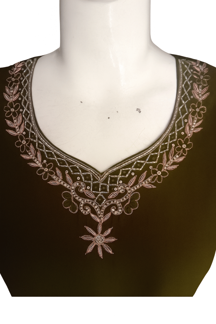 The kurta features a beautifully hand-embellished round neckline, adorned with intricate sequin, zari, and thread embroidery. The neckline is bordered with delicate mirror work and fine detailing that adds a touch of refined glamour without overwhelming the design. The work extends subtly along the yoke, enhancing the overall elegance of the piece.