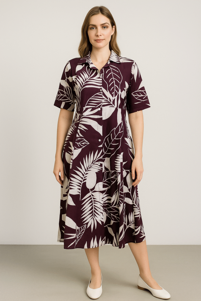 Step into effortless elegance with this plum-colored shirt dress, featuring a bold white tropical leaf print. Crafted from breathable cotton, this midi dress blends comfort with chic style, making it ideal for everyday wear or casual outings. The button-down front and collared neckline add a polished touch, while short sleeves and a relaxed silhouette ensure all-day ease. Pair it with flats or sneakers for a stylish, go-anywhere look.