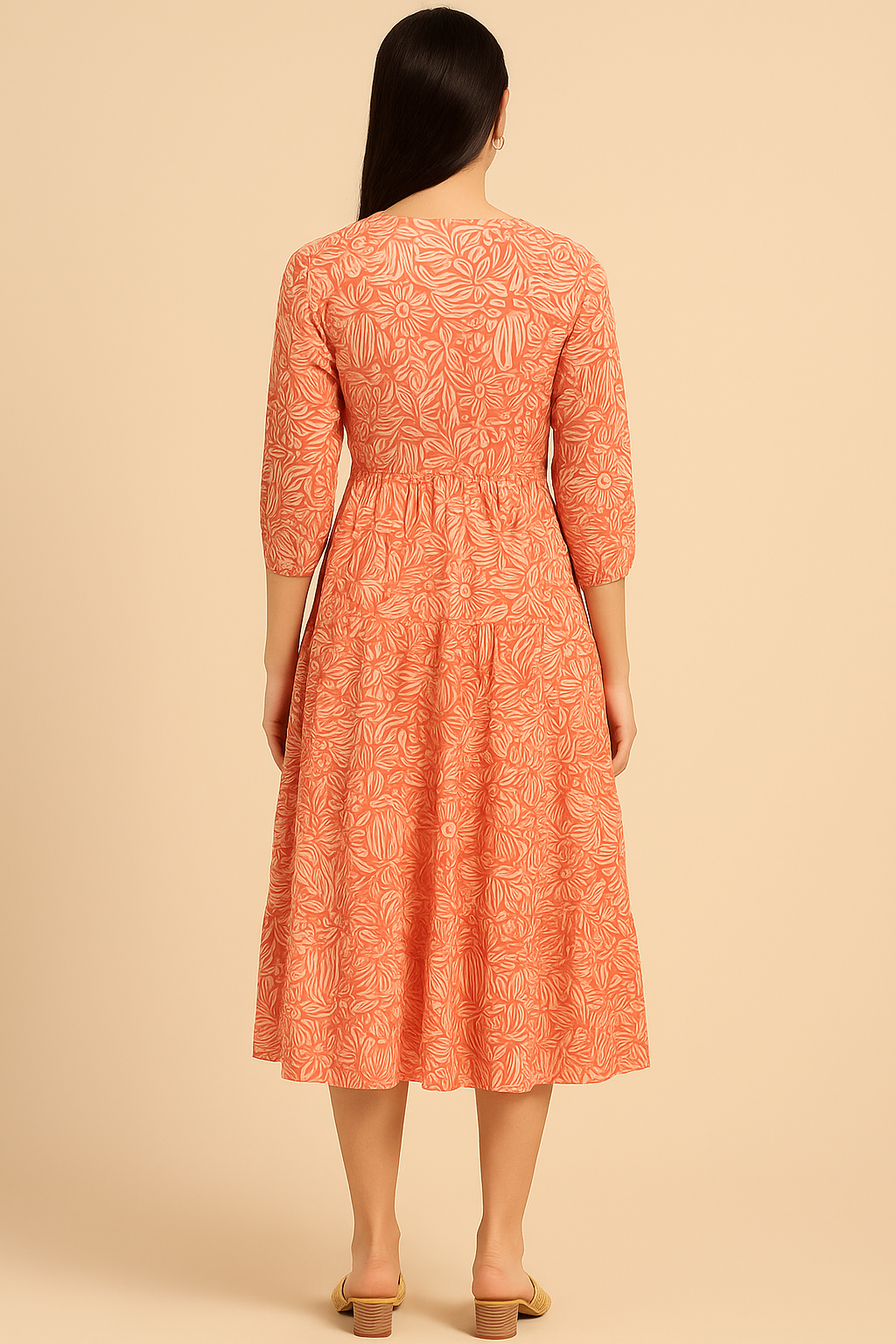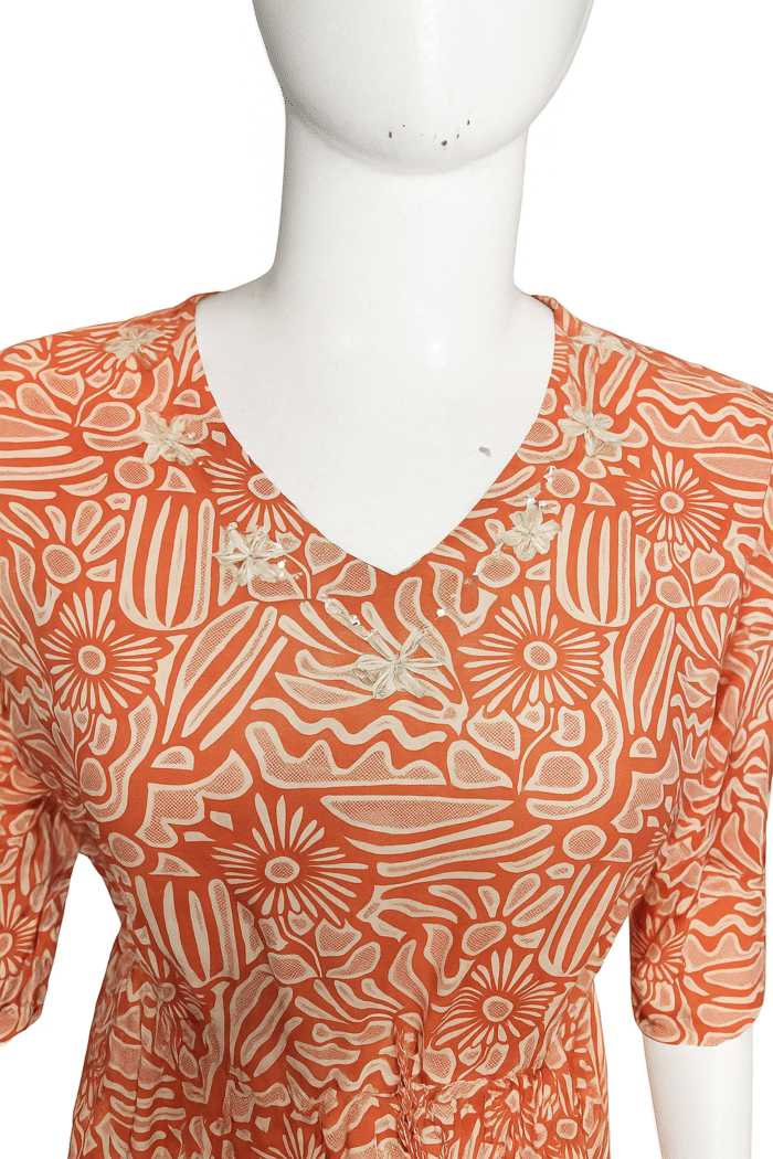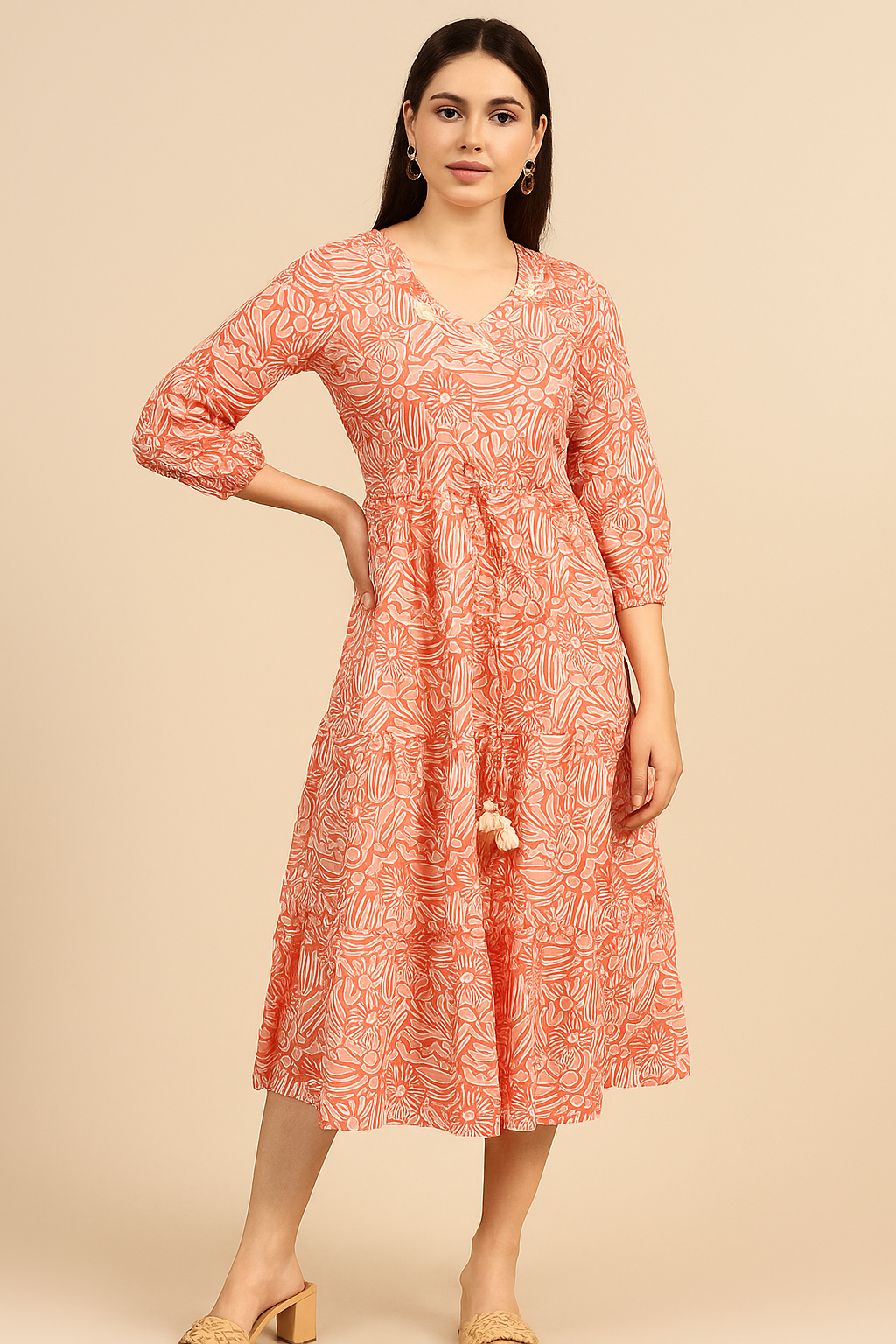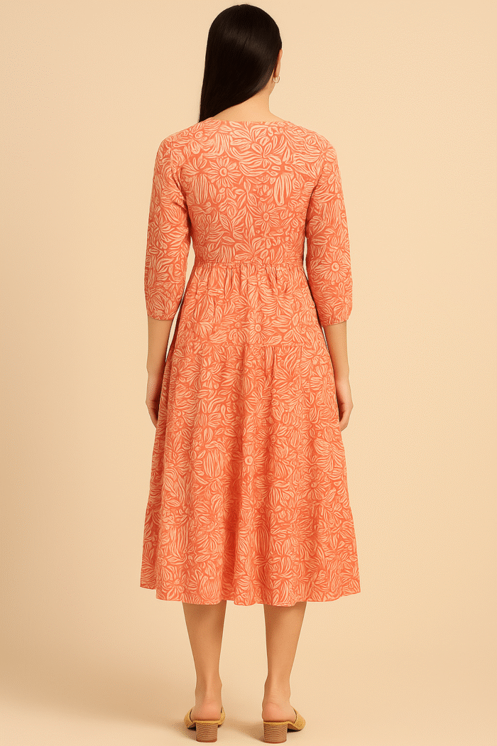 Add a refreshing burst of elegance to your wardrobe with this rust viscose dress, crafted for both comfort and charm. The soft, breathable viscose fabric features a vibrant floral print in contrasting tones, making it perfect for casual outings or festive occasions. The V-neckline is beautifully highlighted with delicate embroidery work, adding a subtle touch of sophistication. Designed with a flattering drawstring waist, the dress comes adorned with charming tassels for a playful finish. The 3/4th sleeves and midi-length silhouette complete the look with effortless grace.