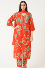 Add a bold splash of elegance to your wardrobe with our Scarlet Blossom Rayon Suit Set. Crafted in soft, breathable rayon fabric, this vibrant red ensemble features beautiful leafy prints in shades of blue and white perfect for festive days or casual ethnic outings.