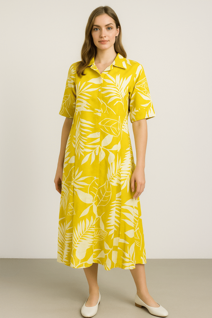 Bring sunshine to your wardrobe with this vibrant Sunlit Leaf Print Cotton Shirt Dress. Featuring a striking yellow base with bold white tropical leaf motifs, this midi-length shirt dress blends effortless charm with breathable comfort. The button-down front, collared neckline, and short sleeves make it ideal for brunches, weekend getaways, or everyday casual wear. Pair it with flats or sneakers for a cheerful, laid-back look that doesn’t compromise on style.