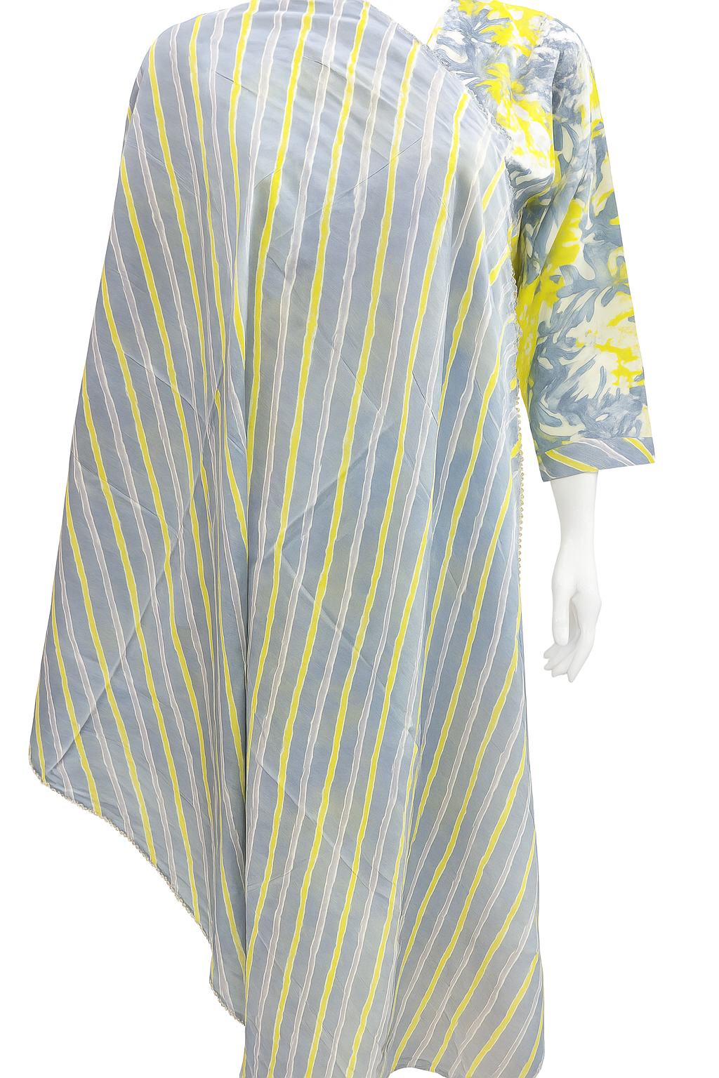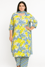 Step into summer freshness with our Sunshine Bloom kurta set, specially crafted for plus-size comfort and charm. Made from breathable cotton, this ensemble features a vibrant yellow and blue floral print that exudes a cheerful, breezy vibe. The kurta is beautifully enhanced with delicate gotta work on the neckline and cuffs, adding a subtle festive touch. Paired with striped palazzo pants and a matching dupatta, this set is perfect for daytime outings, casual gatherings, or festive get-togethers.