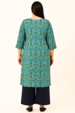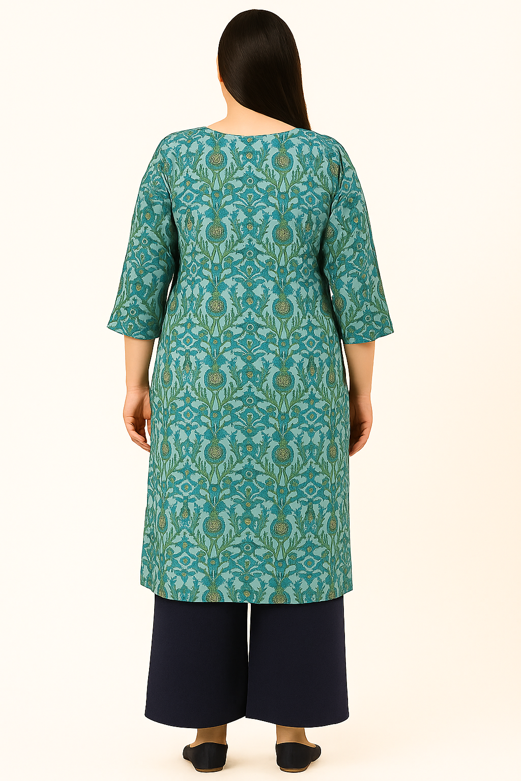 Step into effortless elegance with our Teal Blossom Kurti, crafted in premium rayon flex fabric that offers a soft, breathable feel all day long. The kurti features a rich teal blue base beautifully adorned with intricate floral motifs in shades of green and turquoise, lending it a vibrant yet classy appeal.