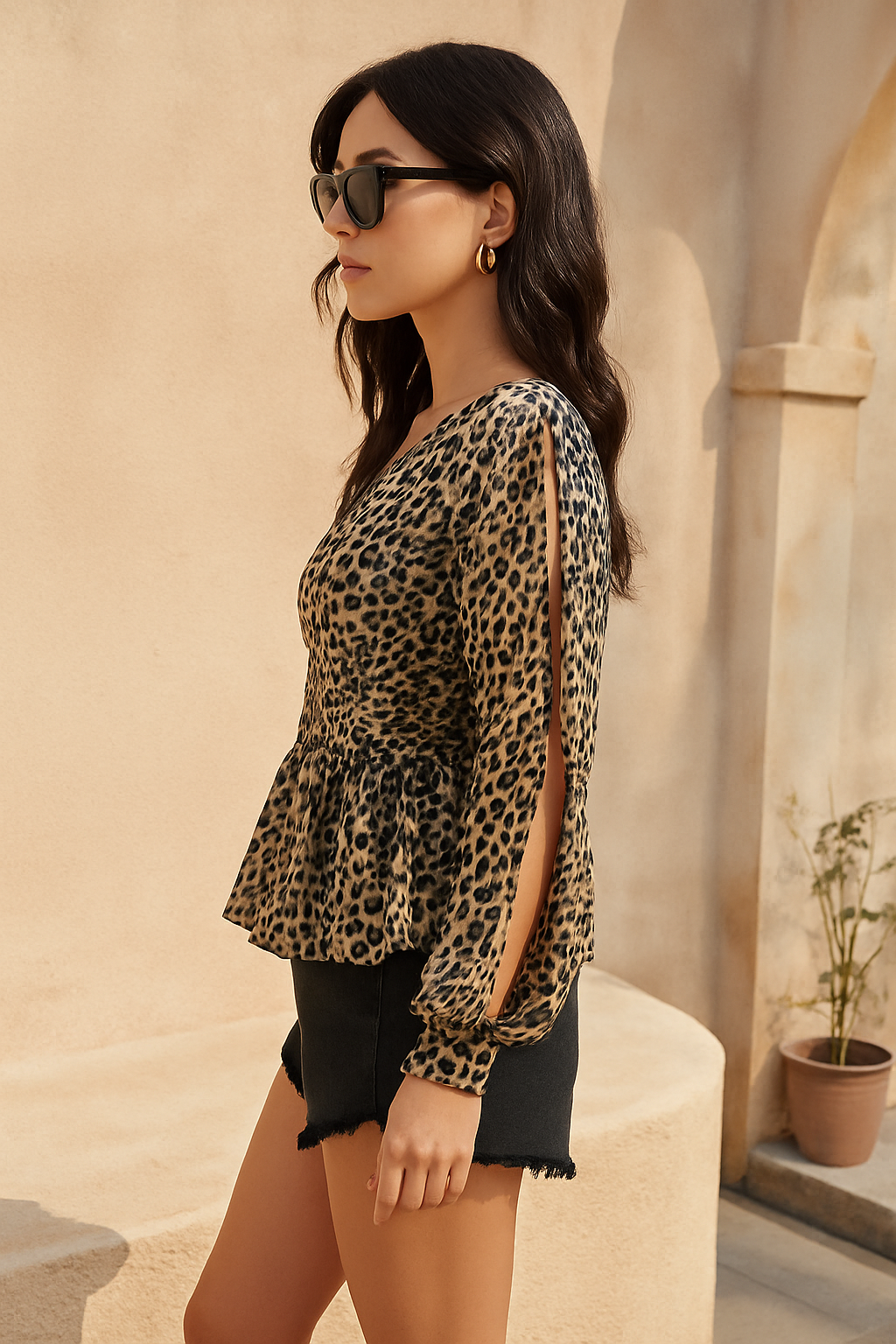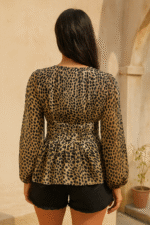Unleash your fierce elegance with the Whisper Wild Leopard print Georgette Top, a statement piece that blends modern chic with untamed charm. Crafted from lightweight, breathable georgette fabric, this top features a bold leopard print that exudes confidence. The silhouette flatters your shape with a cinched waist and a subtle flare, while the front button-down design adds structure.