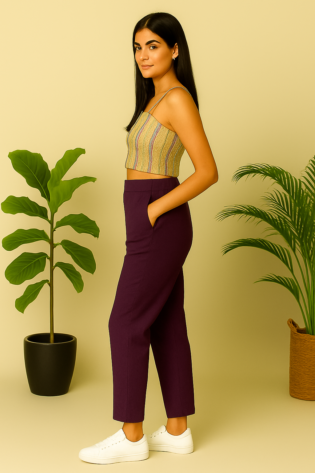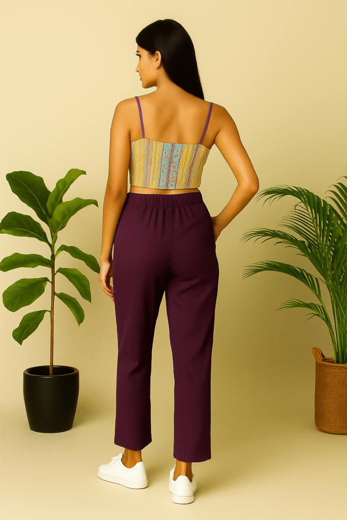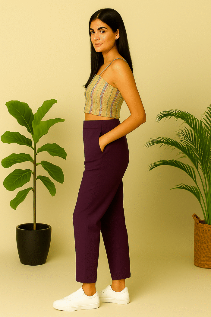 Elevate your casual and smart-casual wardrobe with these stylish wine straight pants, crafted from soft and stretchy cotton lycra for all-day comfort. Designed with a flattering high waist, practical side pockets, and a sleek, tailored fit, these versatile bottoms offer both structure and flexibility. Perfectly paired with crop tops, blouses, or kurtas, they are ideal for workdays, outings, or relaxed evenings. The rich maroon shade adds a touch of elegance and depth to your look.