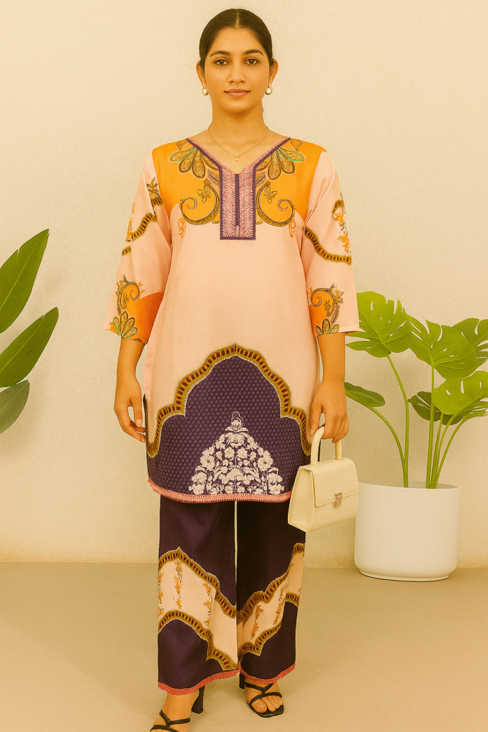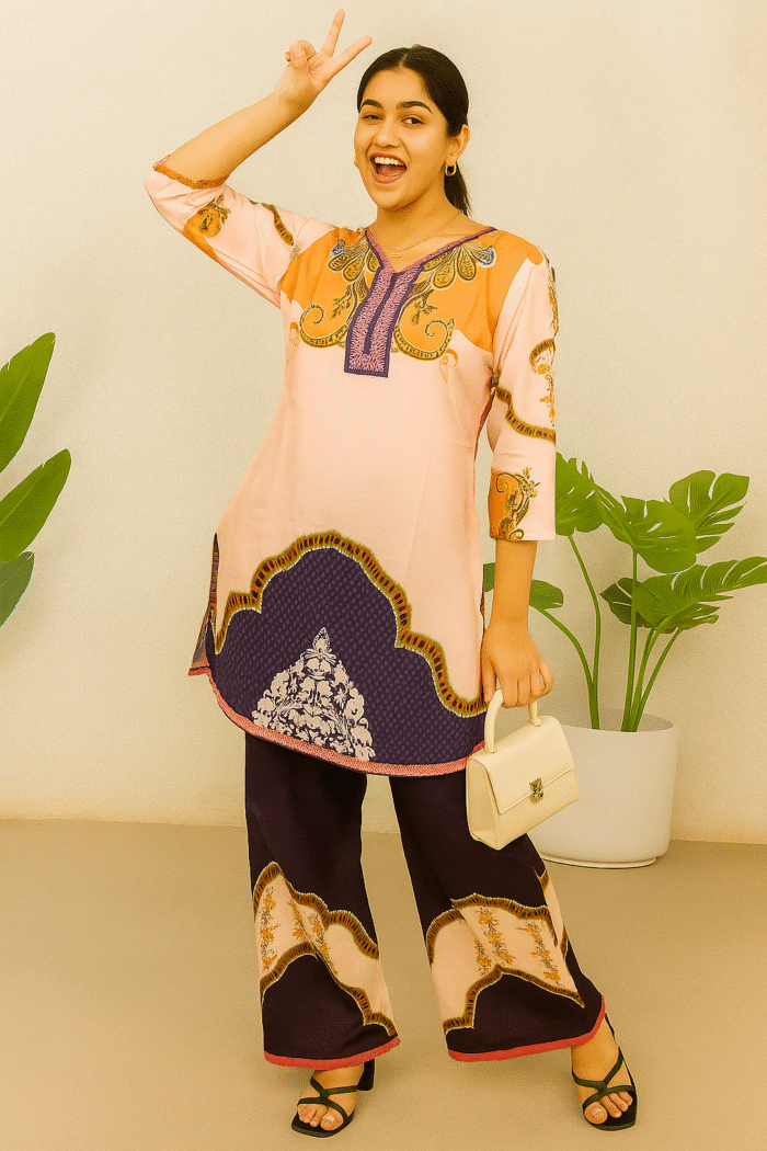 Perfect for brunches, casual outings, or a laid-back festive look, this set strikes the perfect balance between tradition and modern style. Pair it with minimal accessories and a chic handbag to complete the look.