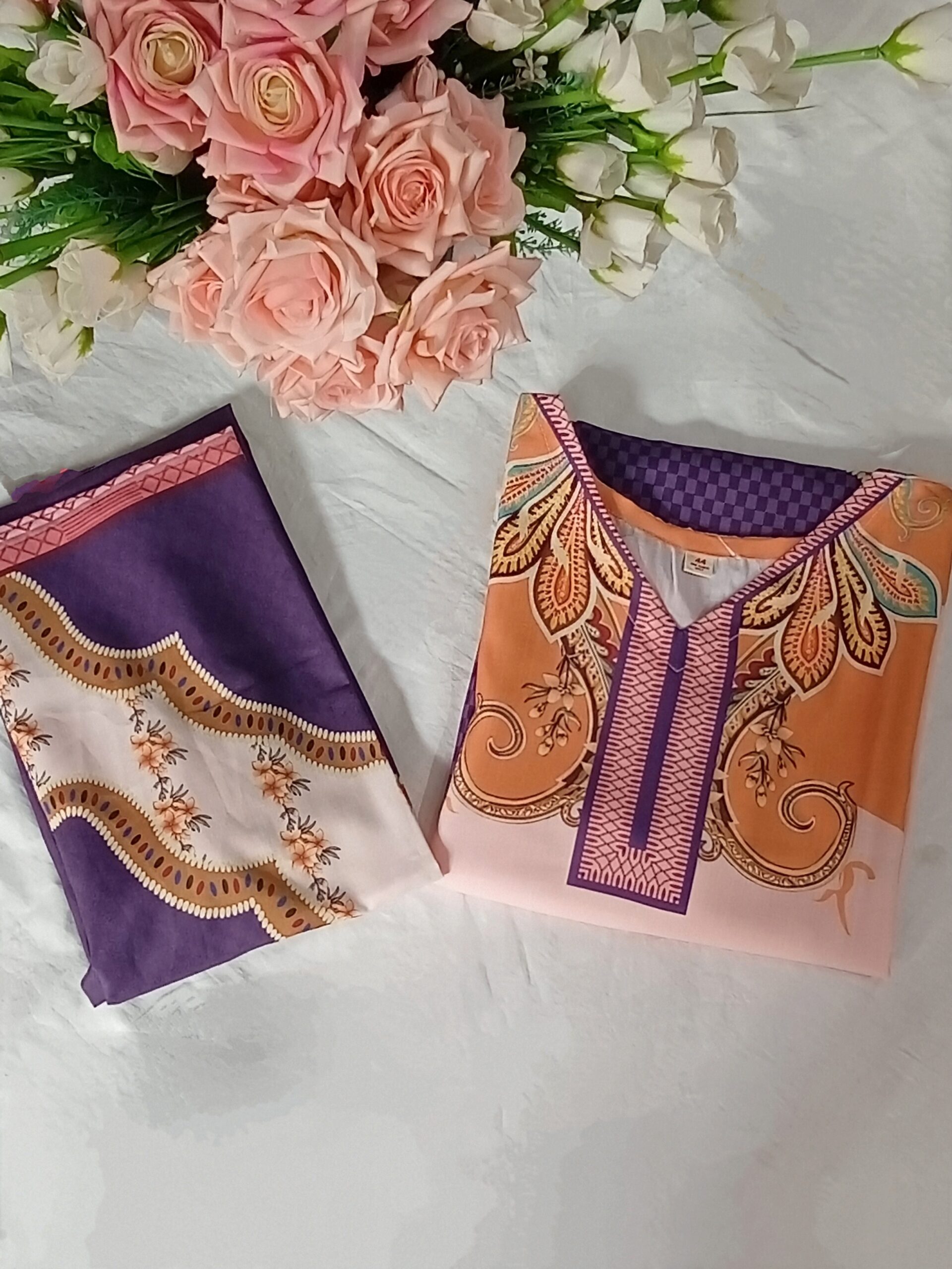 - Color: Baby pink with orange and purple prints